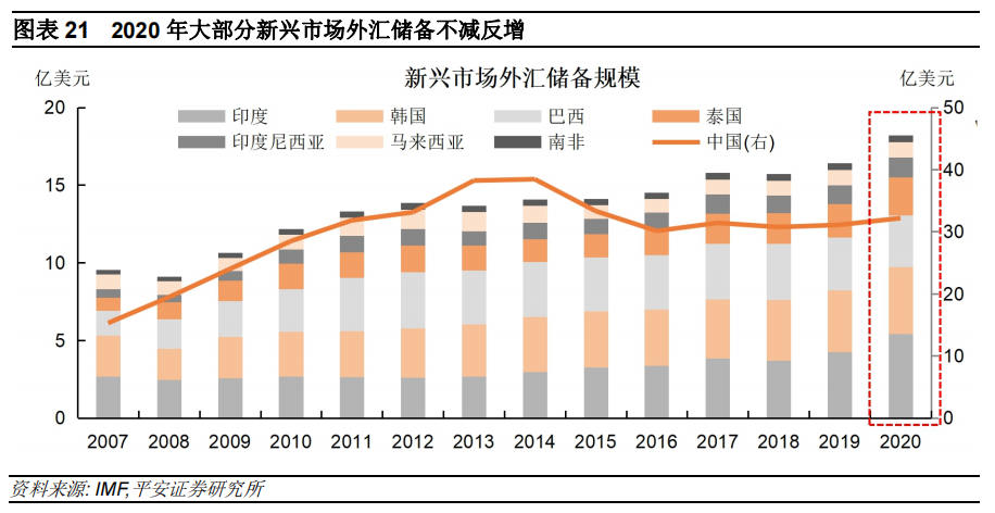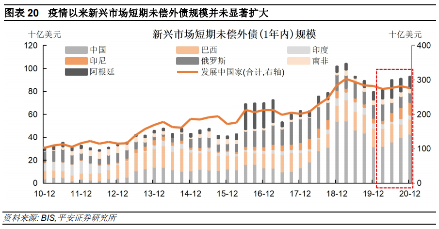 第二,新兴市场短期外债偿付能力增强。一方面,短期未偿外债规模并未显著扩大,短期偿债压力相对可控。诚然,新兴市场的高杠杆、高信贷,客观上加大了这些国家的偿债压力。2020年新冠疫情后,黎巴嫩、阿根廷、厄瓜多尔等新兴经济体相继出了主权债违约事件,进一步加剧了公众对新兴市场偿债能力的担忧。不过,我们认为,短期新兴市场的偿债压力是有限的。BIS数据显示,在2020年的四个季度,主要新兴市场短期(1年期以内)未偿外债规模并未显著扩大,并整体低于2019年上半年水平(图表20)。虽然疫情后新兴市场债务被迫扩张,但未来随着经济继续复苏,新兴市场有望具备更强的偿债能力。从这个角度看,新兴市场债务大概率是可持续的。