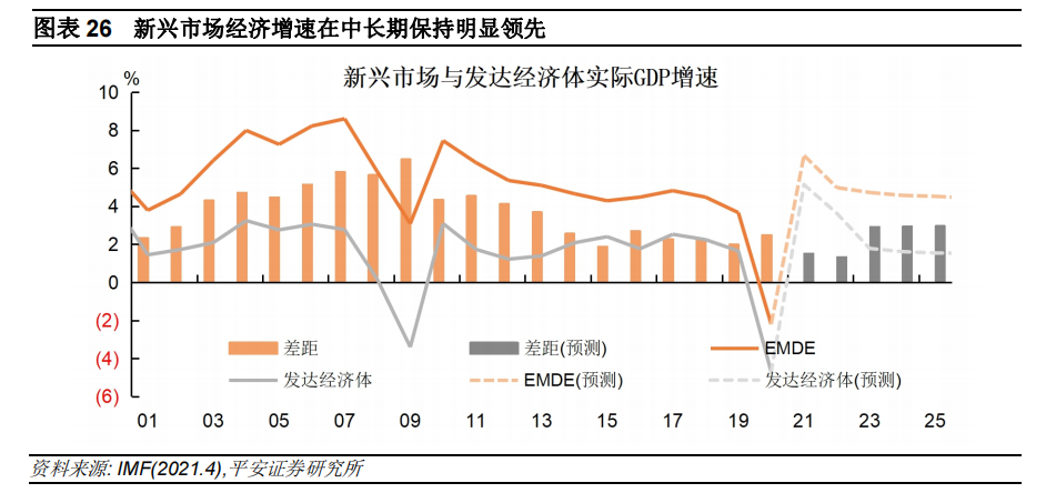 全球经济疫后复苏节奏的特性造就了2020年新兴市场的“强出口”。2021-2022年,新兴市场出口景气有望延续,自身经济亦将在疫苗接种的助推下持续改善。中长期来看,疫情冲击难以改变新兴经济体的增长潜能。扎实且连贯的基本面支撑,使新兴市场具备较强的资本“虹吸”能力。