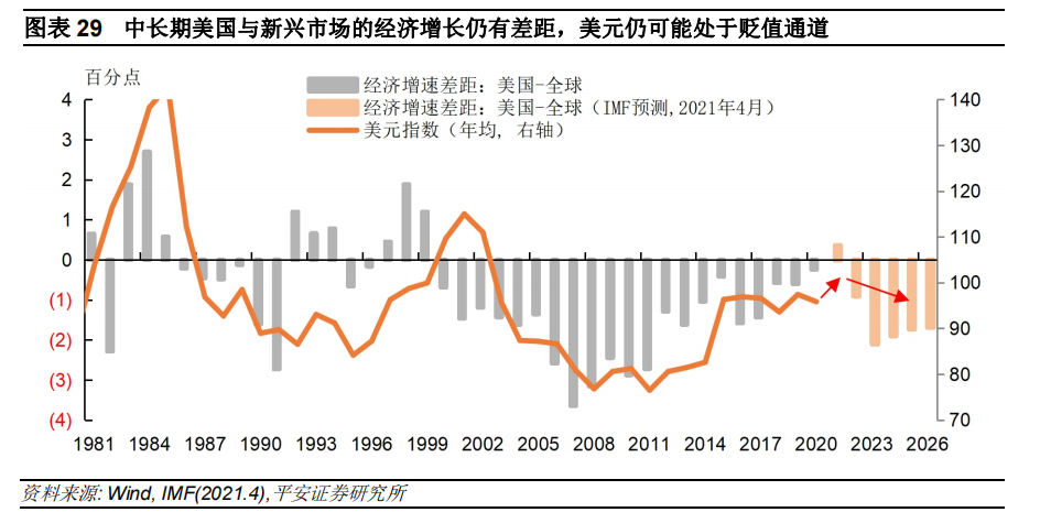 第三,美国与新兴市场的中长期经济增长仍有差距,美元资产的中长期吸引力受限。短期看,美国经济的“一枝独秀”、拜登基建计划以及美联储政策转向预期,使美元走强的逻辑得到强化。但中长期看(2022年以后),随着非美经济相继复苏,新兴市场有望回归较快速度的增长。据IMF最新预测,2022年以后,美国经济增速将继续慢于全球均值,且2023年以后与新兴市场乃至全球经济增长水平的差距会更加明显。这意味着未来美元的走强很可能是阶段性的,中长期内美元仍可能处于贬值通道(图表29)。美元及美元资产的估值天花板,亦将是抑制美元回流的因素。