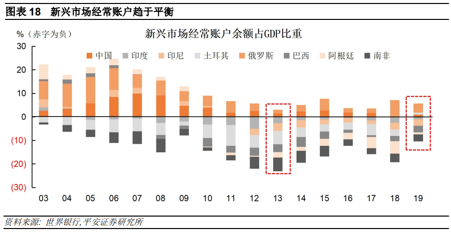 相较发达市场,新兴市场虽然具备较强的经济增长潜能与投资机会,但亦具有一系列脆弱性:对出口的高度依赖、“双赤字”(经常账户赤字+财政赤字)与债务违约风险以及部分国家内部治理问题等。这意味着,全球风险偏好一旦回落,新兴市场的脆弱性将更容易暴露,国际资本投资新兴市场的信心可能快速下滑,致使资本外流。