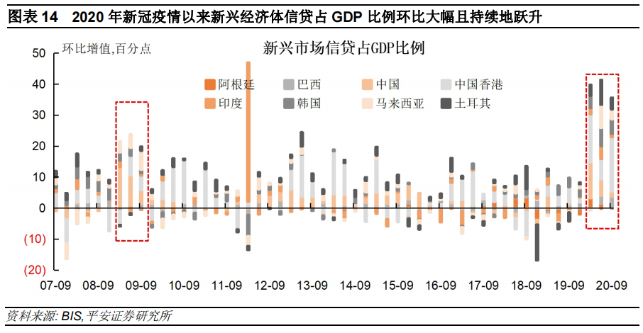 新兴市场信贷缺口扩大,释放金融风险信号。疫情爆发后,新兴市场迎来了一轮显著的信贷扩张,其中一部分来源于本国政府通过银行发放的经济纾困资金,另一部分来自IMF、世界银行和其他外部机构为发展中地区特供的纾困资金。BIS数据显示,2020年前三季度,主要新兴市场信贷占GDP比例环比大幅、持续跃升(图表14)。各国实施经济纾困措施时,大量借助银行等间接融资窗口支持信贷流动,导致一定程度的信贷扩张。但是,信贷“易放难收”,如果新兴市场经济复苏的节奏过缓,则信贷占GDP比例与潜在增长率的差距(信贷缺口)或长期存在,难以收窄。特别是,由于疫情对全球经济的破坏,使得2020年新兴市场的信贷占GDP比例的扩张速度处于历史高位(高于2008年金次贷危机后),未来信贷缺口闭合压力显著。