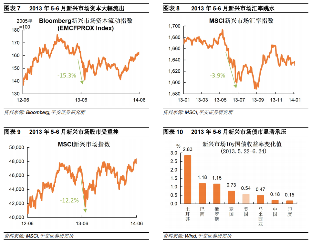 未来一段时间,美联储货币政策转向(正式提及Taper、正式缩减QE以及加息等),均可能继续制造“美元回流”的压力。但是,考虑到:1)新兴市场经济复苏的节奏与金融脆弱性的改善,将对资本保持一定吸引力;2)新兴市场资金外流的空间已经相对有限;3)本轮美联储政策转向的节奏可能更加温和,我们认为,新兴市场或具备较强的能力以抵御部分“美元回流”压力,至少类似2013年“紧缩恐慌”的巨大冲击恐难发生。