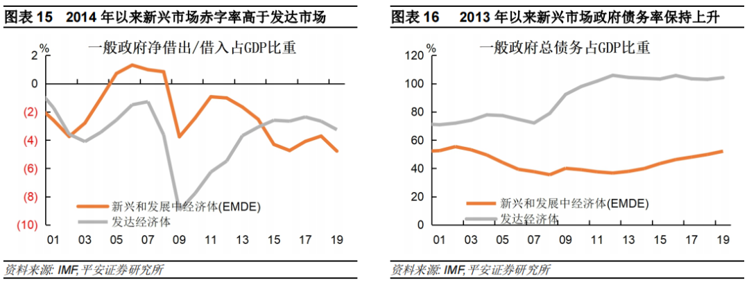 近年来新兴市场财政赤字率高企,政府债务率持续上升。一方面,据IMF数据,次贷危机以后,发达经济体的一般政府赤字率急剧扩张,2009年一度接近9%,但此后一直保持下降趋势。新兴市场的赤字率,虽然在金次贷危机后未至发达市场水平,但2013年以后较快攀升,并于2014年超过发达市场,近5年以来基本保持在4%以上的高位,2019年更出现抬头迹象,达到4.8%(图表15)。另一方面,新兴市场举债能力不及发达市场,次贷危机后债务率并未像发达市场那样大幅扩张。但自2013年以来,新兴市场政府债务率保持上升,由2013年的38%明显上行至2019年的52%,而同期发达市场债务率保持稳定(图表16)。2020年,各国为应对新冠疫情加大了财政支出和借债规模,而大部分国家经济受疫情冲击而收缩,预计赤字率和债务率很可能显著上升,新兴市场的财政平衡与债务压力自然受到市场的高度关注。