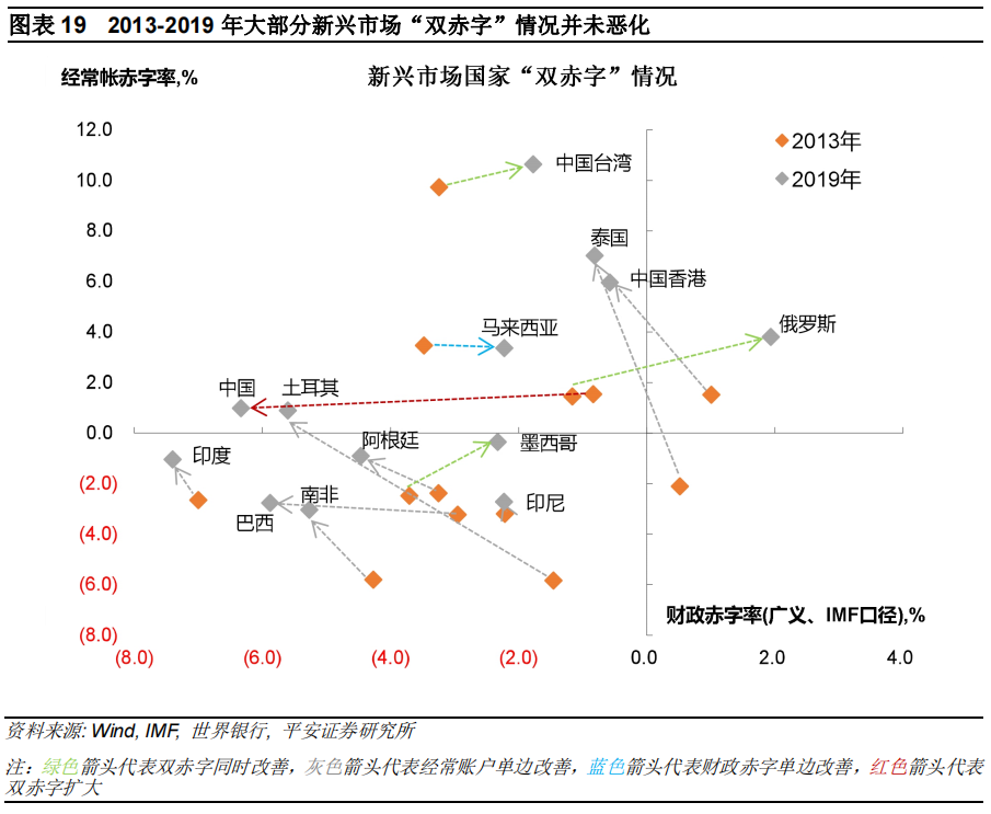 第一,新兴市场的“双赤字”风险相较可控。一方面,新兴市场经常账户趋于平衡。次贷危机以后,以“脆弱五国”(印度、土耳其、巴西、阿根廷、南非)为代表的新兴经济体经常账户赤字率显著扩大,2013年“脆弱五国”平均经常账户赤字占GDP比重约4%。2013年以后,新兴市场经常账户开始迈向平衡,2019年“脆弱五国”平均经常账户赤字率1.4%,比2013年收窄了2/3(图表18)。另一方面,如果同时观察2013年至2019年期间的“双赤字”变化情况,我们发现,绝大部分新兴市场国家的“双赤字”并未同时扩大,大部分国家财政赤字扩张的同时、经常账户赤字是在改善的(图表19)。因此,整体而言,新兴市场的双赤字风险相较可控。