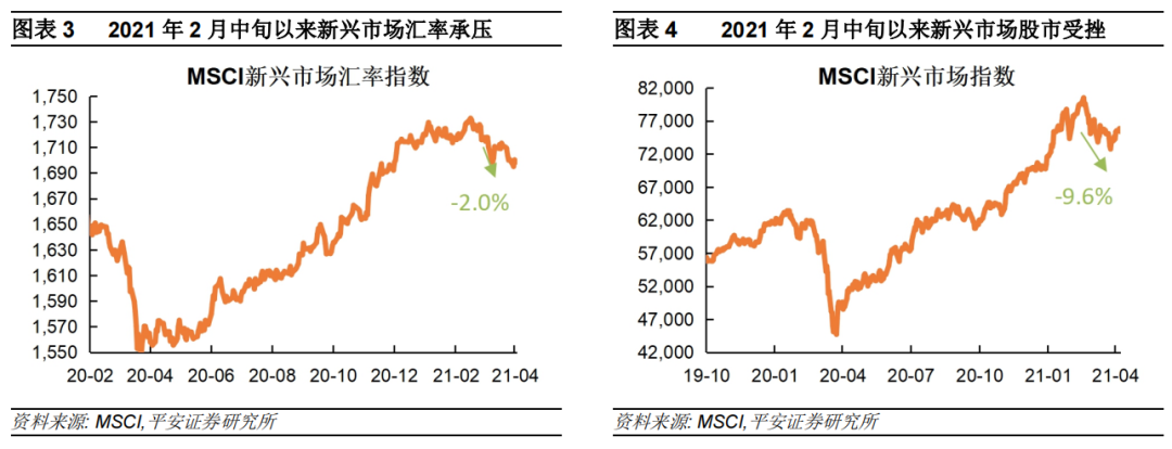 汇率方面,2021年2月中旬以来新兴市场汇率承压。MSCI新兴市场汇率指数在2月15日至3月9日期间下跌2%(图表3)。股市方面,2021年2月中旬以来新兴市场股市受挫。MSCI新兴市场指数,在2月17日至3月25日期间下跌9.6%(图表4)。