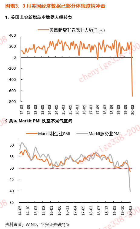 疫情对美国经济的冲击已经逐渐显现在3月的经济数据上。3月美国ISM与Markit关于经济景气度的指标均跌至不景气区间,其中Markit PMI下行幅度显著大于ISM PMI。由于ISM采用的是实际已发生数据,反应相对滞后;而Markit采用的是主观印象调查,且在新订单上比重较大,所以Markit PMI对疫情的冲击反应更为充分。3月非农就业减少70.1万,失业率升至4.4%,周薪增速与劳动力参与率也显著下行,初领失业金人数从3月末的330.7万增长至4月初的664.8万的记录高位。