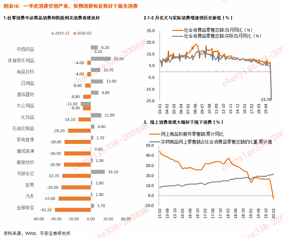 疫情对消费的冲击是最为直接的,社零名义和实际增速分别为-20.5%和-23.7%,创历史新低。1-2月疫情的防控使得消费变化呈现出非常明显的结构性特征:第一,必需品消费和防疫相关消费表现良好。食品饮料和日用品作为居民日常所必须,其消费跌幅较小;疫情防控将人们束缚在家,体育娱乐用品相关消费跌幅较小;而中西药品则是唯一录得正增长的消费类别。第二,可选消费、耐用品消费需求受到明显压制。金银珠宝、汽车、地产相关、服装等消费跌幅均在30%以上,第三,线上消费表现大幅好于线下消费。网上商品和服务零售额跌幅仅-3.0%,实物商品网上零售额占社零总额的比重还有所提升。