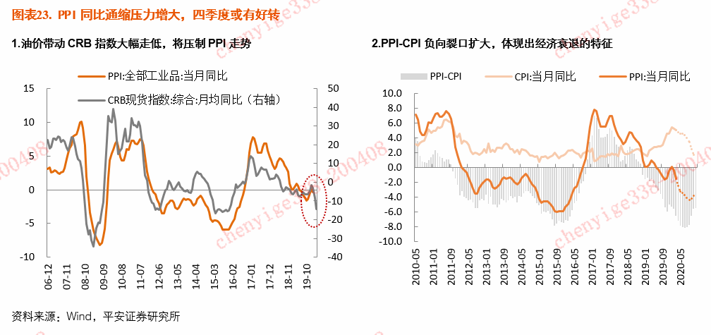 2020年PPI原本的格局是通缩压力逐渐缓解,这主要得益于三方面因素:一是翘尾因素与上年持平;二是消费企稳投资略有反弹,总需求呈现弱平稳;三是CPI高位可能对生活资料分项有所拉动。