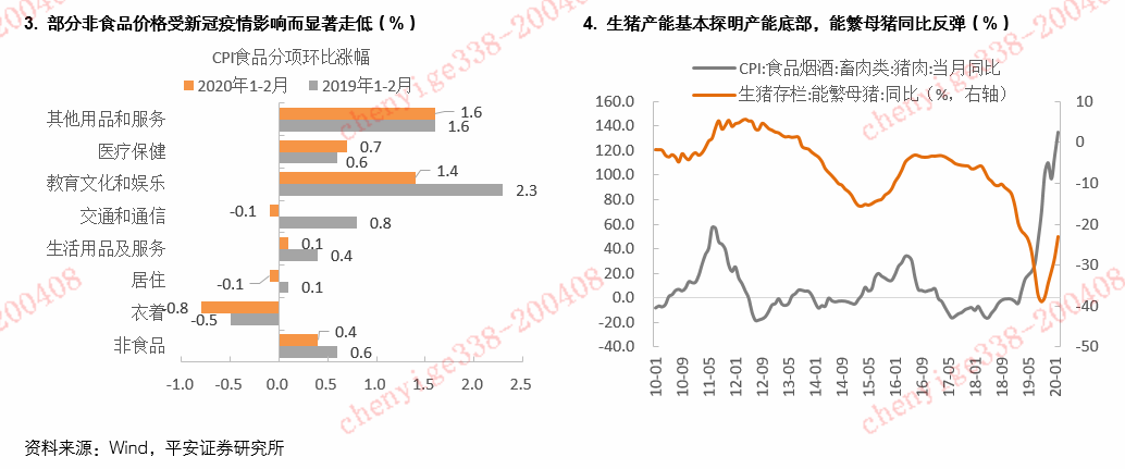 1-2月推升CPI水平的主要动力是食品价格。在疫情爆发期间,得益于政府通过一系列保障民生供应的政策,食品各分项价格并非发生普遍的大幅上涨,除水产品、水果价格环比涨幅略高于历史同期外,仅猪肉价格涨幅大大高于历史同期,是推升食品价格的主力。而另一方面,部分非食品价格受疫情影响而显著走低,如:全国范围内的隔离和交通阻断,导致交通和通信类价格大幅走低;居民隔离在家无法外出消费,使得衣着类、教育文化娱乐类价格显著下降;复工延迟导致租房需求延后,居住类价格也有明显走低。总体上,猪价带动食品价格继续上涨,叠加疫情导致非食品价格低迷,使得CPI与核心CPI同比走势进一步背离。