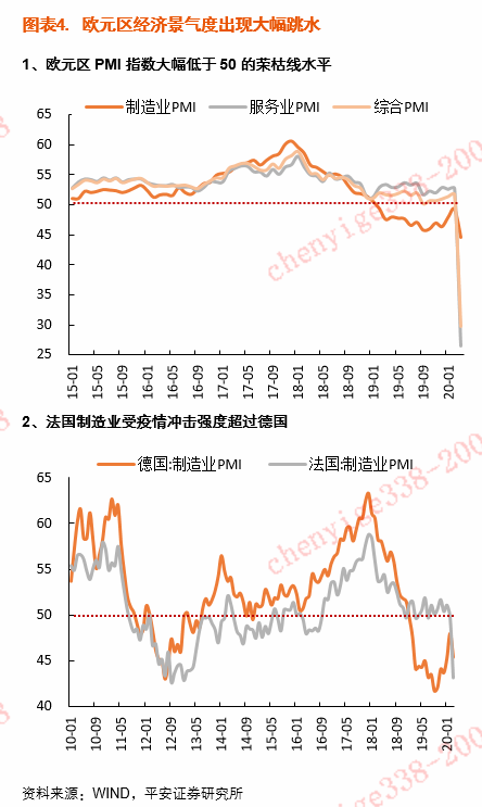 分行业看,欧元区服务业受疫情及防控措施的冲击显著大于制造业,这与餐饮、娱乐等服务业经营人口集中度高有关。分国别看,德国制造业受到的冲击小于法国,而意大利等南欧国家受冲击最大。可以发现,意大利、西班牙等疫情最严重的国家经济几乎停滞,法德两国虽然疫情相当,但是法国制造业中的奢侈品、红酒制造等都与服务业的景气度相关性较高,而德国的重化工业与服务业关联度较弱。