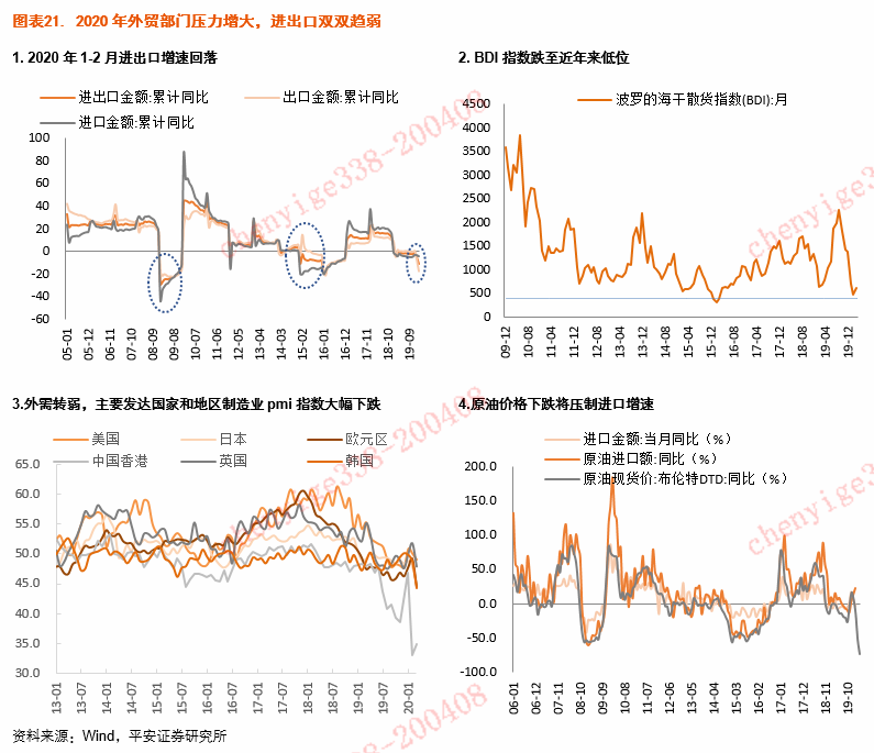 2020年进出口的原本格局为出口弱势修复和进口边际改善。出口方面,人民币有效汇率贬值和东盟 RCEP贸易摩擦缓和有利于出口恢复,而全球经济增长走弱与中美关税负效应继续发酵则可能压制出口增长。进口方面,总需求弱势平稳和扩大进口战略对进口增长形成支撑,但大宗商品价格的下跌将压制进口。