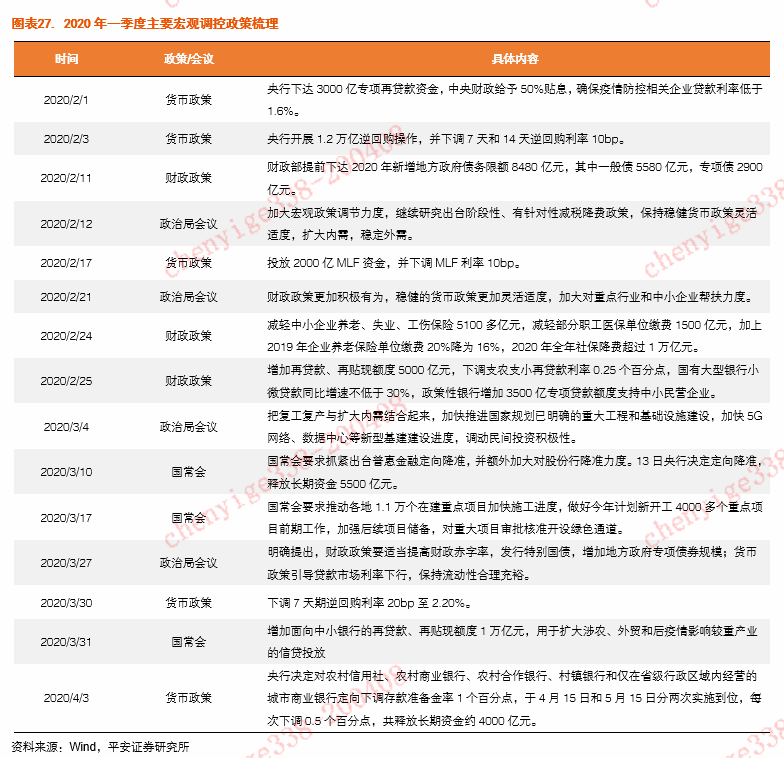 总体上看,前期财政政策措施主要集中在抗疫防疫相关的活动上,对于居民和企业部门的支持也多是以受疫情直接冲击或参与防疫工作为前提。此外,相对于央行前后超过3万亿流动性支持,4000亿降准长期流动性注入,及1.8万亿再贷款、再贴现额度支持而言,一季度财政完成的1.08万亿专项债为去年底提前下达的规模,对市场预期的额外提振不足。这也是市场此前质疑财政政策发力有所滞后的原因。