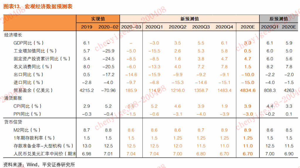 因此,基准情景下,我们预计二季度中国经济将仍然处在缓慢恢复的过程中;如果全球疫情在2020年8月基本得到控制,则国内经济活动可能到三季度能够完全恢复常态,但外需的修复则可能要等到四季度。总的来说,全年实现GDP相对2010年翻一番目标压力较大,不排除两会下调全年经济增长目标。目前我们预计2020年四个季度GDP增速分别为-3.0%,3.5%,5.5%,6.1%,全年GDP增速在3.3%左右。