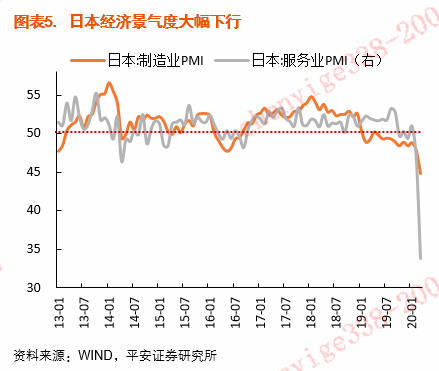 在疫情冲击内需与外需的双重影响下,日本经济景气度大幅下行,制造业PMI从2月47.8%跌至3月的44.8%,服务业PMI从2月的46.8%跌至3月的33.8%;均大幅低于荣枯线水平。经济加速下行背景下,日本央行再次开启针对ETF等资产的购买计划,这对于稳定资本市场固然有阶段性效果,但会进一步绑架“日本央行—银行—企业”的关系,导致银行系统成为上市公司的重要持股方,社会的固化程度与金融体系的脆弱性恐进一步加剧,经济社会缺乏新陈代谢恐为未来埋下隐患。