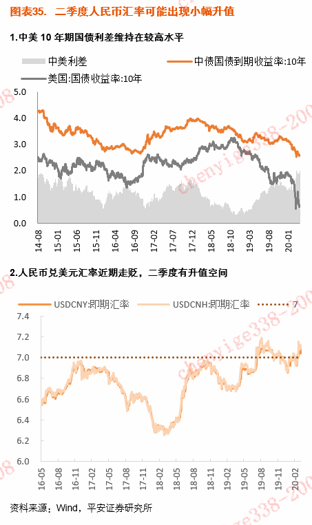 尽管如此,我们认为对于人民币汇率的短期走势并不必悲观,二季度人民币兑美元可能出现小幅升值。一方面,中国的疫情形势大幅好转,疫情的错位带来了中国与海外基本面的重大差异,二季度中国经济有望成为拉动全球经济增长的主导力量。另一方面,当前中美10年期国债收益率利差保持在190bp左右的高位,这大大提升人民币资产的吸引力,二季度中国资本账户可能会面临一定程度的资本流入,从而推动人民币升值。