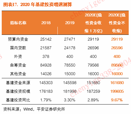 不过,从基建资金来源看,在财政明确积极发力的情况下,地方隐性债务资金对基建项目的支持可能存在一定的不确定性。其一,中央预算内资金得益于财政赤字的扩张,大体能保持原有对基建支持的规模;其二,专项债将从两方面对基建提供额外支持,一是专项债规模的扩容,二是专项债投向基建等项目的比重在上升;其三,不确定性在于政府对地方隐性债务的态度,在隐性债务不进一步收缩的背景下,预计2020年基建投资增速将有望接近10%。