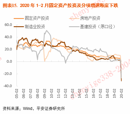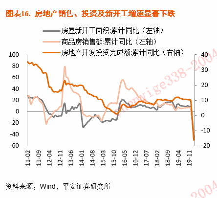 1.房地产投资。疫情冲击之下,房地产投资将受到几个方面的制约:其一,疫情导致土地出让延后、开发商施工进度延后,都将直接影响房地产投资;其二,疫情导致商品房销售增速显著下跌,房企销售回款缩水的同时仍面临刚性的债务和费用支出,这将限制房企的投资空间;其三,疫情带来的国内外经济衰退的预期,可能延后甚至直接打压购房需求,这将影响房企的投资意愿。不过,当前房地产供给侧政策已有所松动,主要旨在缓解房企现金流压力,降低行业面临的金融风险;而需求端则是“房住不炒”与“因城施策”的政策相结合,预计房地产投资将在当前的水平上逐步修复。