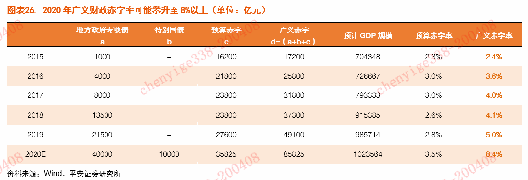 不过,3.27政治局会议已明确表态,财政政策发力将会通过适当提高财政赤字率,发行特别国债,增加地方政府专项债券规模等手段。4.3国新办新闻发布会上,财政部副部长许宏才也表示,国务院已部署再提前下达一批地方政府专项债额度,带动扩大有效投资;但提高赤字率与发行特别国债均需全国人大审批,具体措施有待两会召开之后落地。根据上述表态,我们预计2020年财政赤字率有望达到3.5%左右,地方政府专项债达到4万亿左右,发行特别国债1万亿左右,按照前述预测2020年GDP增速在3.3%左右,则三者合计广义赤字率将在GDP的8.4%左右。相对于此前几年的赤字水平来说,2020年积极财政的支持力度将大大增加。