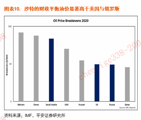 随着疫情的冲击扩大,全球原油需求大幅萎缩。在该背景下,沙特等国原计划在3月初的OPEC+会议上推进在现有减产210万桶(170万桶+额外备用40万桶)的基础上实施进一步减产,但俄罗斯未能同意该减产计划,原因如下:第一,此轮国际原油价格下跌主要是受到新冠疫情的冲击所致,与以往全球经济持续弱势带来的价格下跌不同,这一波油价大跌的驱动因素——新冠疫情具有较大的不确定性,持续时间和影响强度都无法准确预估,在疫情持续蔓延带来的中短期需求疲弱的背景下,即使采取进一步减产举措,也难以对国际油价产生显著提振。第二,近几年来沙特领导的OPEC+利用协同减产稳定了原油市场,也使得油价持续位于50美元/桶的水平之上,但是美国页岩油一直在大幅增产,不断蚕食以沙特与俄罗斯为代表的OPEC+成员国的市场份额,导致沙特、俄罗斯受损严重,俄罗斯显然不愿意此类事情再次发生。第三,沙特与俄罗斯经济均高度依赖石油出口,但相对而言,俄罗斯的经济更为多元化,而沙特对石油出口的依赖度更强。按照2018年的数据,俄罗斯能源产品出口占总出口的比重略大于50%,而沙特则达到86%的水平,故而沙特对石油出口的依赖度更高;另外,俄罗斯的财政相对更为健康,预算也更为充裕,根据IMF数据,2020年俄罗斯的财政平衡油价为50美元左右,远低于沙特的84美元,就“石油价格战”的博弈地位而言,俄罗斯的信心与能力显然更强。