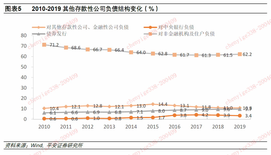向中央银行借款核算的是央行采用逆回购、中期借贷便利(MLF)、常备借贷便利(SLF)、抵押补充贷款(PSL)、短期流动性调节工具(SLO)等一系列央行货币工具向商业银行投放的款项。银行向中央银行借款在央行的资产负债表中对应的是对其他存款性公司债权这一科目,而在银行的资产负债表中则体现为对中央银行负债这一科目。作为央行逆周期调节工具,向中央银行借款增速有明显的周期性特点,且波动较大。就占比而言,2010年到2019年,其它存款性公司负债中对中央银行负债的占比从2010年的0.6%提高到2017年的4.2%,2019年则为3.4%。央行创设的上述逆回购、MLF等货币工具将基础货币的传导由原先的外汇占款转向了对商业银行的债权,向中央银行借款的上升期间对应的是外汇占款的趋势性回落。分不同类型银行看,中型银行债券发行占比最高,达6.5%;大型银行占比为3.9%;小型银行为2%。