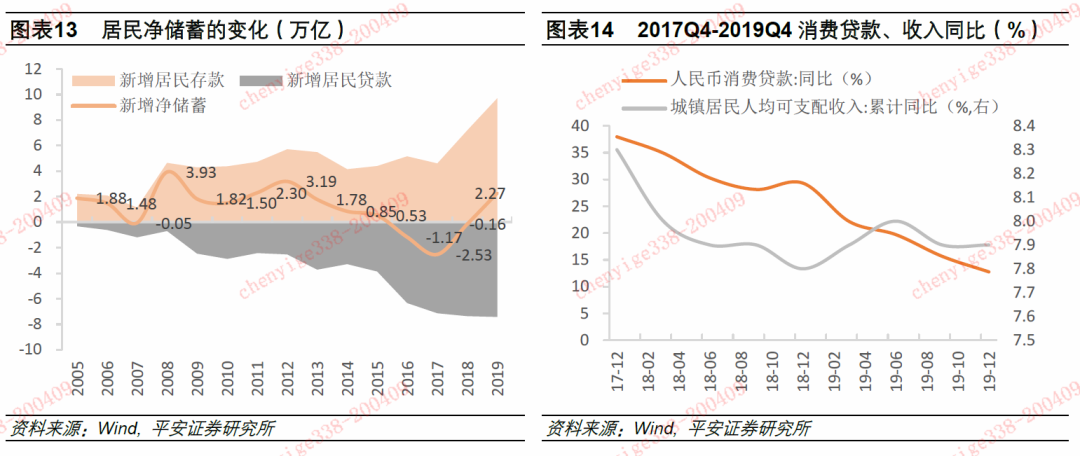 消费方面,信用卡、消费贷、分期贷以及互联网带货,促进了居民杠杆率水平的提升,2017年四季度到2019年四季度,城镇居民可支配收入同比增速由8.3%下降到7.9%,而人民币消费贷款同比增速尽管从38%高位下降到12.8%,依然高于可支配收入同比增速。