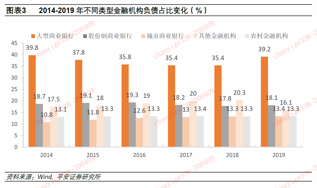 就负债占比来看,商业银行负债自2017年以来有集中化的趋势,大型国有商业银行负债占比从2017年的35.4%进一步提高到2019年的39.2%;股份制商业银行、其它金融机构以及农村金融机构的负债占比分别下降了0.1、3.9和0.1个百分点;而城商行的负债占比则提升了0.4个百分点。商业银行负债的集中化趋势表明原本就能以低成本吸收存款的国有大型商业银行在老龄化、利率市场化、监管趋严以及同业缩减等一系列趋势下,相比较其它类型的银行机构在负债端的优势更加明显。