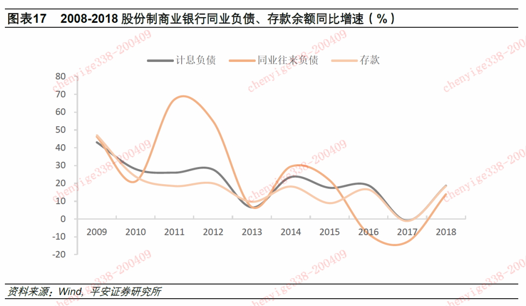 就不同类型银行而言,国有大行存款增速相对稳定,同业业务比重较小,减少同业负债的压力也相对较小,国有大行往往为同业资金的净融出方,因此总体而言国有大行在面对同业监管时受到的影响相对较小;城商行、农商行不同银行之间同业业务占比差距比较大,不同银行在面对同业监管趋严时受到的影响也有所不同;对于股份制商业银行来说,同业业务一度是扩大资产负债表、赚取息差利润的重要手段,因此股份制商业银行负债中同业负债的占比普遍较高,且作为主要的同业资金净融入方,受到同业业务监管趋严的影响也相对较大。2011年,股份制商业银行同业负债同比增速为67.1%,而当年股份制银行计息负债同比增速为28%,存款同比增速为21.1%;2017年,股份制商业银行同业负债同比增速为-12.9%,计息负债和存款的同比增速分别为-0.9%和-1.1%。