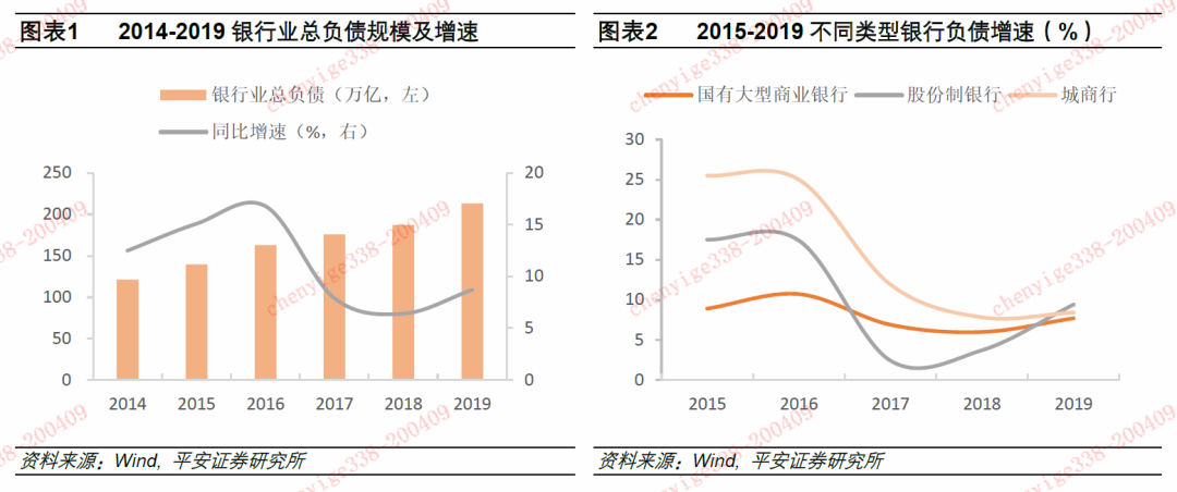 2019年,商业银行的总负债规模为213.09万亿。2016年,受金融供给侧改革以及监管趋严的影响,银行业负债规模增速有所回落,由2016年的16.8%下降到2017年的7.9%,之后又回升到2019年的8.7%。对于不同类型的商业银行,负债增速均有所下滑,但幅度有所分化。城商行的下降幅度最大,增速由2016年的25%下降到2019年的8.4%,下降了16.6个百分点;大型国有商业银行的下降幅度最小,由2016年的10.7%下降到2019年的8.4%,下降了2.3个百分点;股份制银行居中,增速由2016年的17.5%下降到2019年的9.4%。