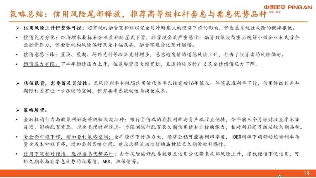 杠杆与久期策略:长久期高等级杠杆套息,短久期高票息防御。1)全年经济下行压力大,IOER利率下调带动短端利率与资金成本中枢下移,增加套利策略空间,建议选择流动性好的品种拉长久期做杠杆操作;2)由于风险偏好改善较难且信用分化带来尾部风险上升,建议谨慎下沉信用,可短久期参与有票息优势的私募债、ABS、担保债等。