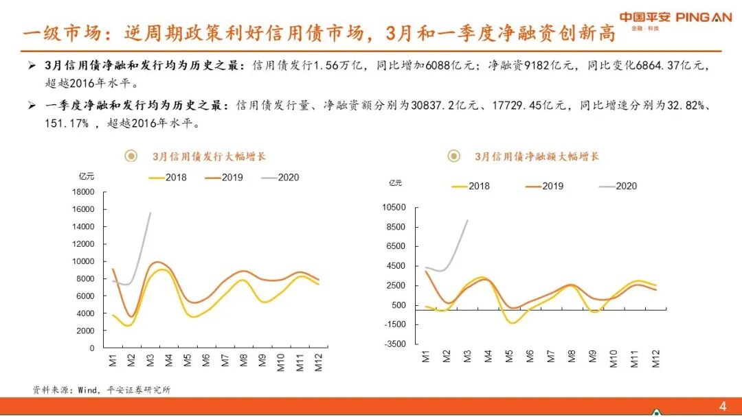 市场回顾:政策推动牛陡,信用违约隐蔽化。一季度及3月份信用债发行和净融均达历史之最;资金面宽松,基准利率牛陡,带动信用债曲线陡峭化下行,信用利差和期限利差被动走阔;当前高等级期限利差上升到历史高位,中高等级间的评级利差在历史低位进一步压缩。一季度信用违约率下降,但瑕疵兑付显著增多。