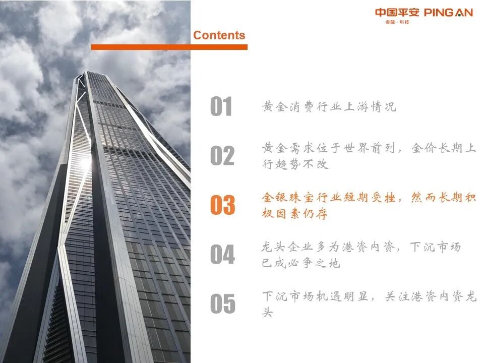 如何投资黄金消费行业?1、短期内行业外部环境并不乐观:我国宏观经济增速下行,叠加新冠病毒疫情对全球经济造成的严重冲击,都将影响居民的消费能力,行业短期增长动力不足。2、行业长期发展的积极因素仍在:我国经济发展稳中向好、居民消费能力持续提升,低线城市金银珠宝消费的潜力十足,行业长期发展动力仍在。3、港资、内资龙头企业更具优势:港资、内资龙头企业在下沉市场知名度高、加盟/经销网点密布,或能在下沉市场占得先机,市场份额有望持续提升,建议关注周大福、周大生等。