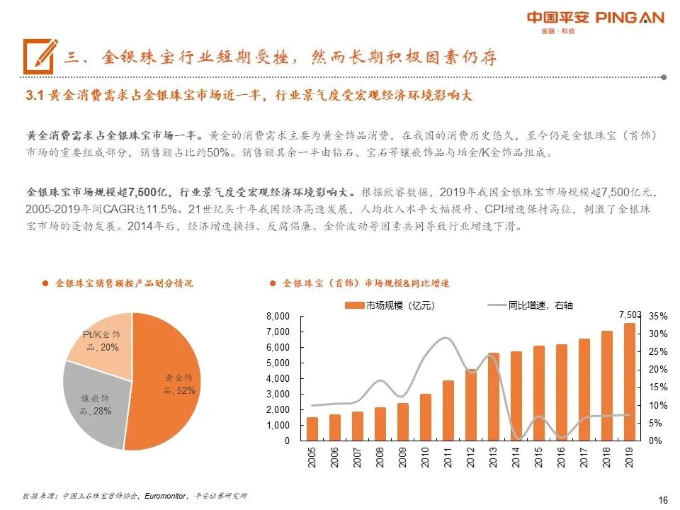 金银珠宝行业特点是什么?黄金饰品属于金银珠宝首饰行业,行业市场规模超7,500亿,其中黄金约占一半。行业景气度受宏观经济环境影响大,近年来人均消费额提升空间有限、消费支出增速下行,行业增量空间受限。与此同时,新冠病毒疫情重挫线下消费,叠加全球经济陷入负增长,短期内金银珠宝消费的增长动力不足。此外,结合过往历史看,若金价过快上涨,或也将抑制黄金消费需求。