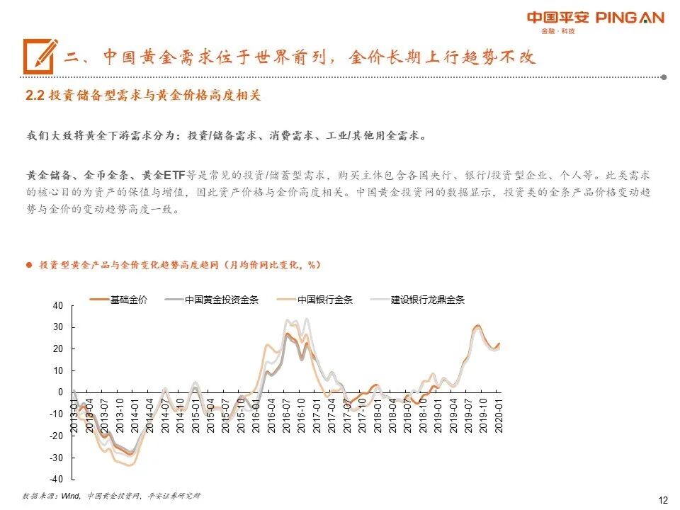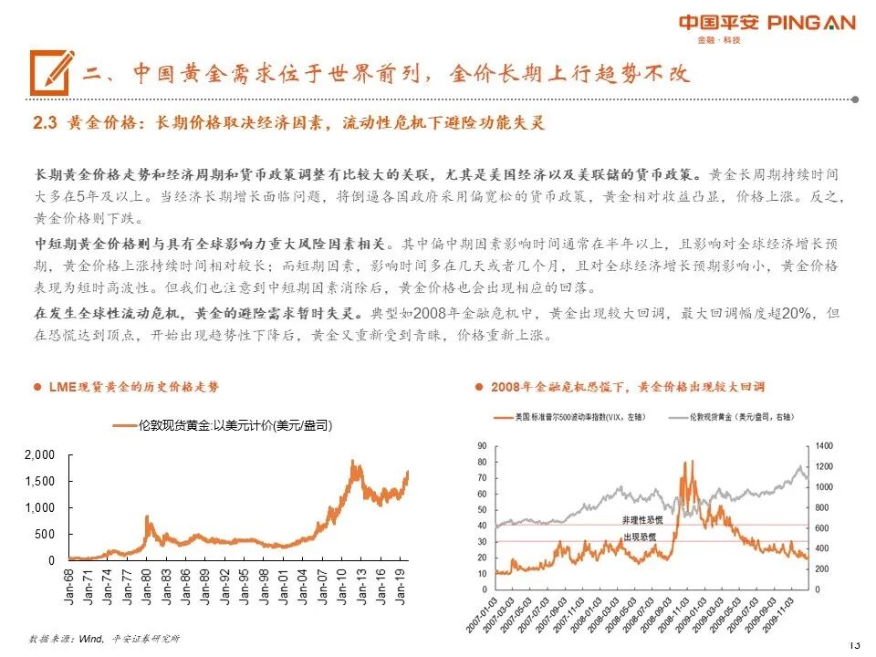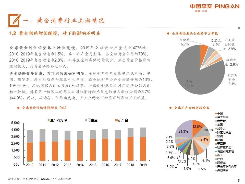 黄金上游供给、价格对下游需求有何影响?黄金需求的上游为资源开采与冶炼,全球黄金的储量波动幅度小、供给零散且增长缓慢(10-19年CAGR仅1.5%),因此对下游影响并不明显。黄金价格方面,长期看与经济周期和货币政策调整有比较大的关联,尤其是美国经济以及美联储的货币政策。短期看金价与具有全球影响力的重大风险因素相关,在发生全球性流动危机(如本次全球新冠病毒疫情)之时,黄金的避险需求暂时失灵,但疫情并没有改变黄金价格长期上行的趋势。