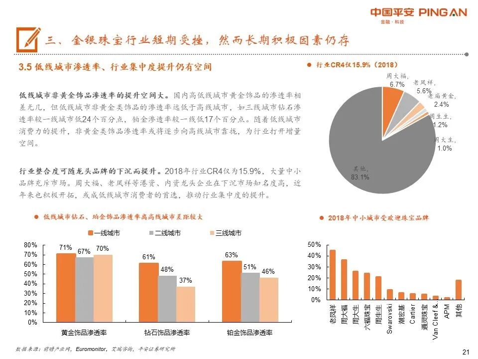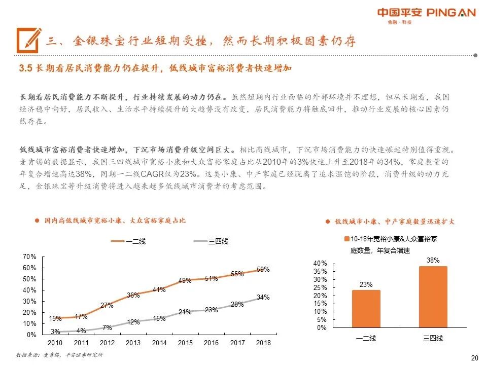 金银珠宝行业发展动力是什么?从长期看,居民消费能力不断提升,行业持续发展的动力仍在。其中低线城市富裕消费者快速增加,10-18年CAGR达38%,下沉市场消费升级空间巨大。同时,低线城市非黄金饰品渗透率的提升空间大,行业整合度可随龙头品牌的下沉而提升。下沉市场已成各品牌的必争之地。