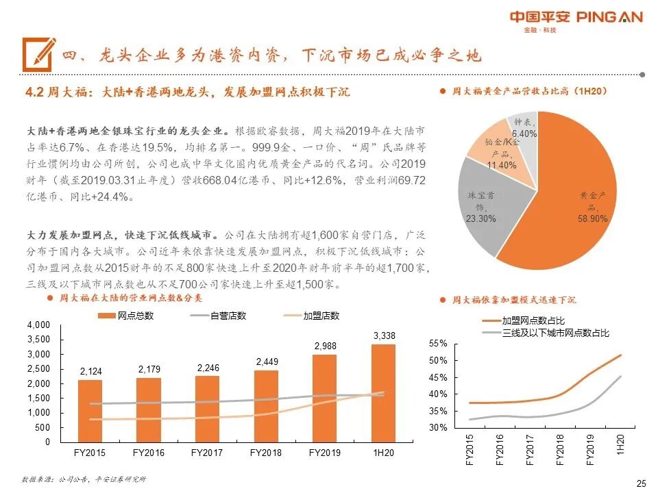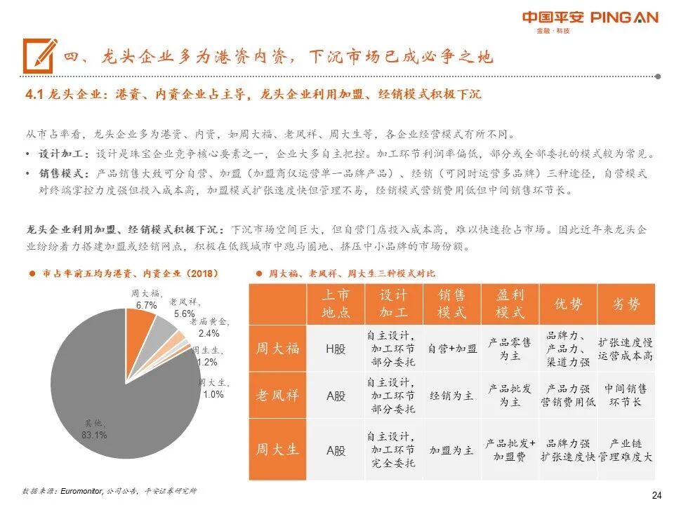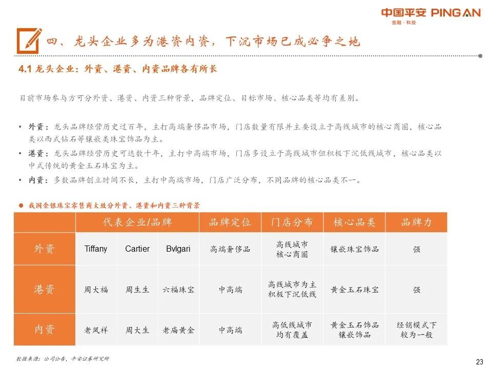 金银珠宝企业如何竞争?目前市场参与方可分外资、港资、内资三种背景,品牌定位、目标市场、核心品类等均有差别。从市占率看,龙头企业多为港资、内资如周大福、老凤祥、周大生等。这些企业近年来利用加盟、经销模式,全国范围内快速铺设了数千个网点,以开拓下沉市场、挤压中小品牌市场份额。