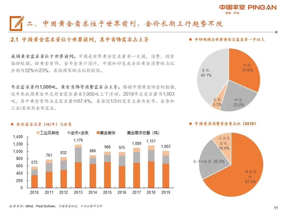 黄金消费是什么?我国黄金需求量位于世界前列,年总需求量约1,000吨。我们大致将黄金下游需求分为:投资/储备、消费、工业/其他用金三种。其中消费占总需求量约1/3,主要为黄金饰品等需求。
