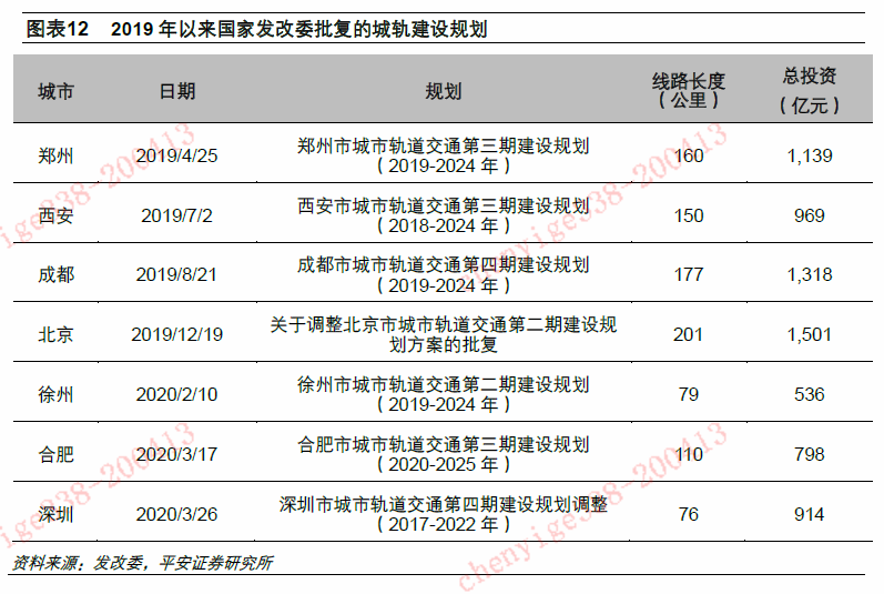 2020年以来,城轨建设规划批复节奏加快。2020年1季度,发改委先后批复徐州市城市轨道交通第二期建设规划(2019-2024年)、合肥市城市轨道交通第三期建设规划(2020-2025年),深圳市城市轨道交通第四期建设规划调整(2017-2022年),涉及线路里程分别为110公里、79公里、76公里,投资额分别为798亿元、536亿元、914亿元。相比2019年全年4座城市的批复,2020年1季度批复了3座城市建设规划,批复节奏显著提速。