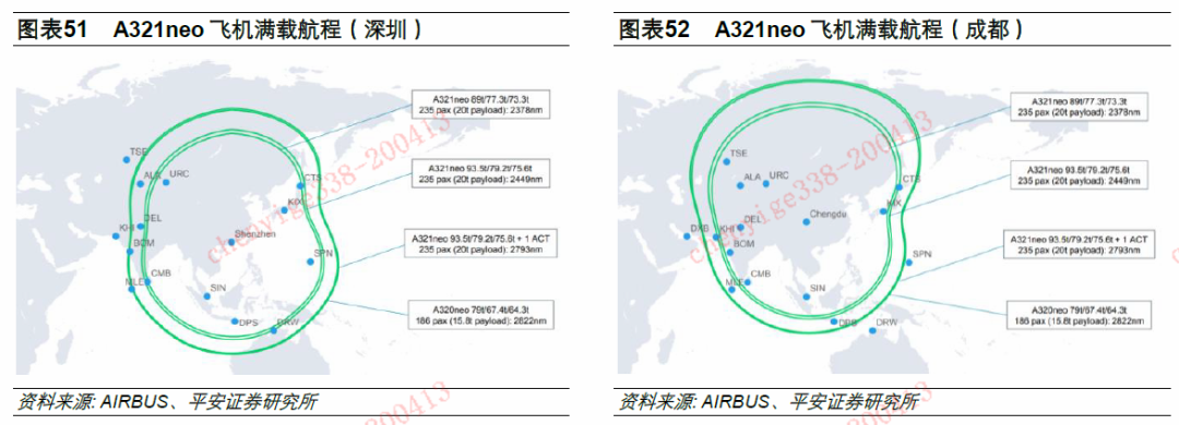 从北京、上海、广州、深圳、成都等城市为始发,上述主要增量市场大部分处于在6000公里范围以内,参考A321neo飞机的性能参数,该机型能够很好的适应这部分市场。