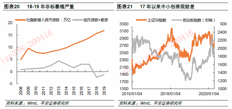 再融资压力为违约主要矛盾的背景之下,企业更愿意通过低价交易为自救赢得时间。18年违约和以往不同,更多受到外部融资收紧而不是经营恶化的影响,19年融资环境有所改善,但是信用分层现象仍然明显,弱资质企业的融资压力仍然较大,因此企业更希望能够通过低价交易来尽可能保住企业。外部融资收紧的表征有三个,一是18年以来非标显著压缩,二是中小创指数在17-18年均跑输大盘股,且这两年政策收紧了股票再融资,因此上市公司及其母公司的权益及股票质押融资能力受到明显限制,三是信用债发行中民企和低评级占比显著下降。