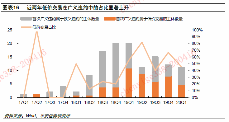 17年到20年一季度低价交易造成的首次违约主体在所有新增违约主体中占比40%,分年度来看该比值在19年和20年一季度显著高于17和18年。2017至2020年一季度,广义违约口径新增违约主体数量为124家,其中首次违约属于狭义违约的有75家,占比60%,剩余为低价交易,占比40%。该比值17年以来逐年上升,19年达到59%,20年一季度略下降到45%。