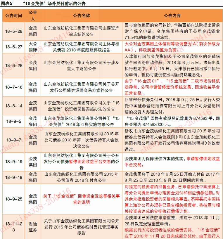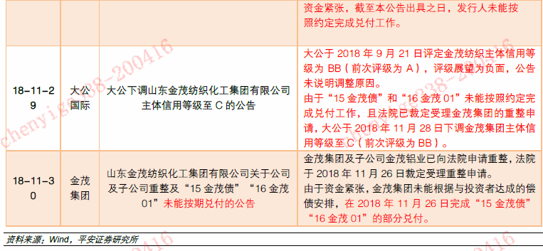 大公国际评级行为:18年5月发行人出现债务纠纷后,大公国际在6月将发行人和债项的评级由AA下调到A;11月25日,发行人破产重整被受理后,11月29日大公国际公告称大公于9月21日将发行人主评下调到BB,鉴于发行人破产重整以及未完成兑付展期的回售款,大公于11月28日下调发行人主体评级到C。