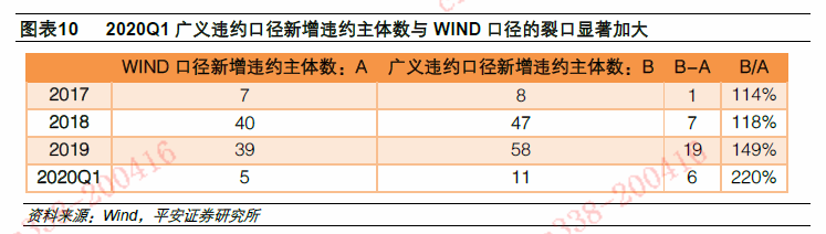 广义违约口径新增违约主体数量变化趋势和WIND口径差异不大,近两年裂口逐渐增大,今年一季度裂口加大更明显。两个口径之下18年新增违约主体数量均较17年显著上升,19年开始逐步下降,但广义违约口径下降速度明显更慢,使得二者的裂口在19年显著加大,而今年一季度裂口更大。