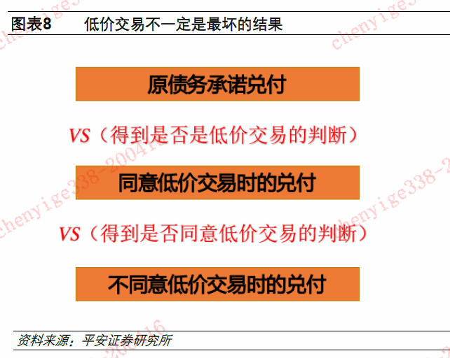 不是所有的债务重组都属于低价交易,是否被判定为低价交易与债权债务双方是否协商一致无关,关键是看债务重组是否明显对投资人造成了损失以及低价交易是否构成避免债券狭义违约的必要条件。按照标普和国内评级机构的观点当债券发行不利于投资人的债务重组时会被视为违约,但具体标准比较主观。标普认为当债务重组没有足够补偿措施,投资者收到的价值低于原承诺时,会将债务重组视为违约。具体操作中标普会观察低价交易前老券的价格是否明显低于面值、发行人资质状况、债务重组条款等。如果债务人财务正常,投资人能够同意的偿债义务减少幅度也较小,因此一般情况下,避免债券狭义违约而进行的债务重组必然大幅减少债务人偿债义务。