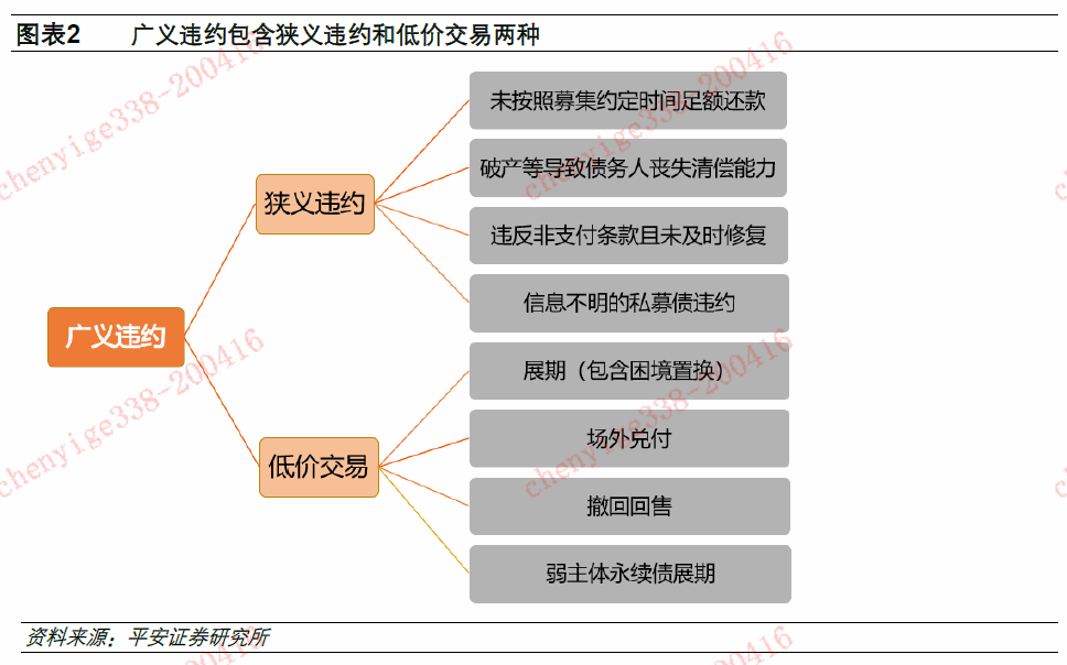 评级机构根据合同约定和偿债义务是否减少来定义违约,其定义下的违约可称为广义违约,包含狭义违约和低价交易两部分。评级机构定义下的违约包含四种,前三种和募集说明书中的描述比较相近,第四种是低价交易。按照标普等三大评级机构定义,低价交易是指债权债务双方达成的旨在较大幅度减少债务人偿债义务的债务重组,国内评级机构也称之为消极债务重组。而国内外评级机构基本将低价交易视为违约。国内债券低价交易通常是指展期、场外兑付和撤回回售等。