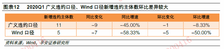 今年一季度WIND口径下新增违约主体数量环比显著下降,而广义违约口径的环比下降幅度非常小。2020年一季度广义违约口径新增违约主体共计11家,同比减少9家,同比增速为-45%;环比减少1家,环比增速为-8.33%。Wind口径新增违约主体数共计5家,同比减少7家,同比增速为-58.33%;环比减少5家,环比增速为-50.00%。