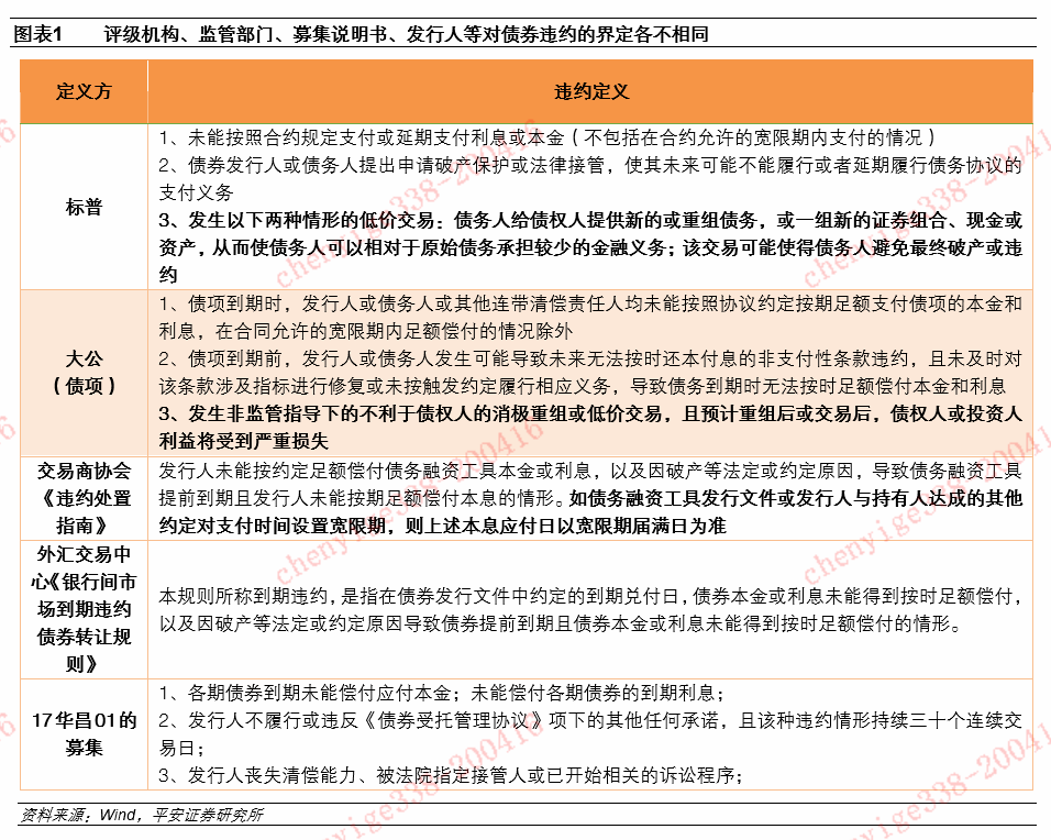 当前国内债券募集说明书中定义的违约可称之为是狭义违约,包含三类。当前国内募集说明书大致定义了三类违约,这三类违约可统称为狭义违约。一是最常见的违约,在国内债券公告中也被称之为实质违约,这种违约是指没有按照合同约定按时足额还本付息,若合同设置有宽限期,那么宽限期内完成还款不算违约;二是发行人出现解散、破产、被接管或者其他导致发行人无法按时还款的事件;三是发行人发生可能导致未来无法按时还款的非支付性条款违约且没有及时进行修复。在实践中很多私募债信息披露不明,无法判定是否属于这三类违约,但是国内当前市场环境下发行人会优先保证公募债兑付,私募债的次级属性较大,因此实际研究中我们可以笼统将信息不明的私募债违约归为狭义违约。