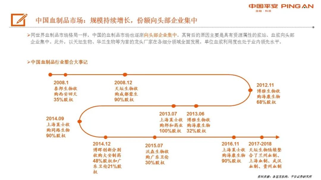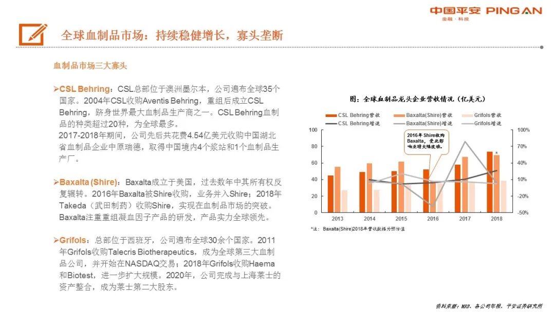 CSL Behring、Baxalta、Grifols三巨头占据全球血制品市场(不含重组)60%以上,且地位难以撼动。行业主要通过并购提升集中度。