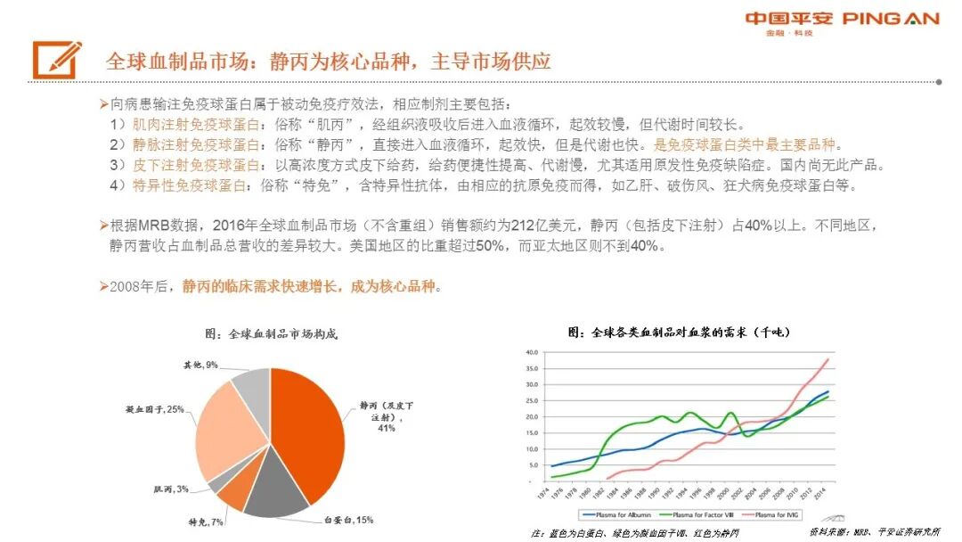 静丙(包括皮下注射)占全球血制品市场(不含重组)销售额40%以上。2008年后静丙临床需求快速增长,成为主导市场的核心品种。