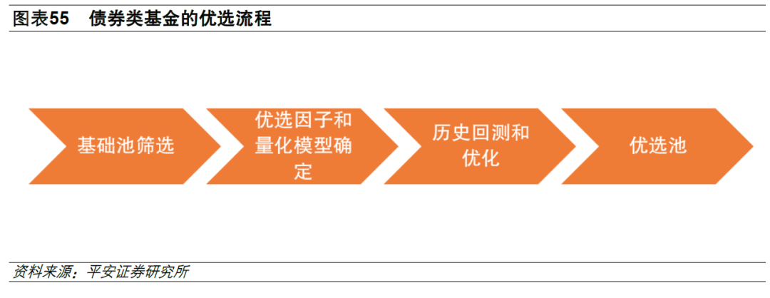 基金优选的目标是寻找到未来市场上业绩能够持续优秀的基金。在我们的优选体系中,会先对债券类基金进行分类,然后按照不同类型从业绩评价-风格归因-量化优选三个步骤进行优选。