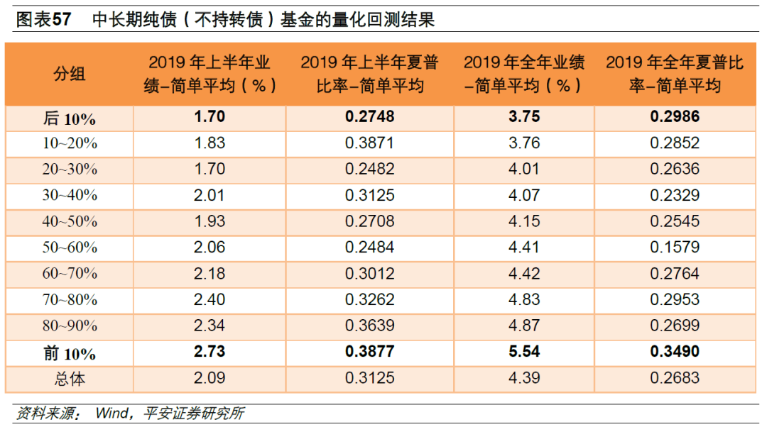 444只中长期纯债(不持转债)基金按照18年的数据计算总得分,然后平均分成10组,分析各组19年上半年和全年的收益和夏普比率指标。从结果来看,所选因子和量化模型也可以有效的选择出未来一年业绩优异的基金:1)按照业绩来说,前期综合得分越高,后期业绩(不管是半年业绩和全年业绩)越好,表现出非常明显的分层。前10%组的19年业绩为5.54%,比后10%组3.75%的业绩高出1.78个百分点。2)从风险调整后收益来看,前期综合得分越高,后期夏普比率基本表现较好,但是没有表现出非常明显的分层。